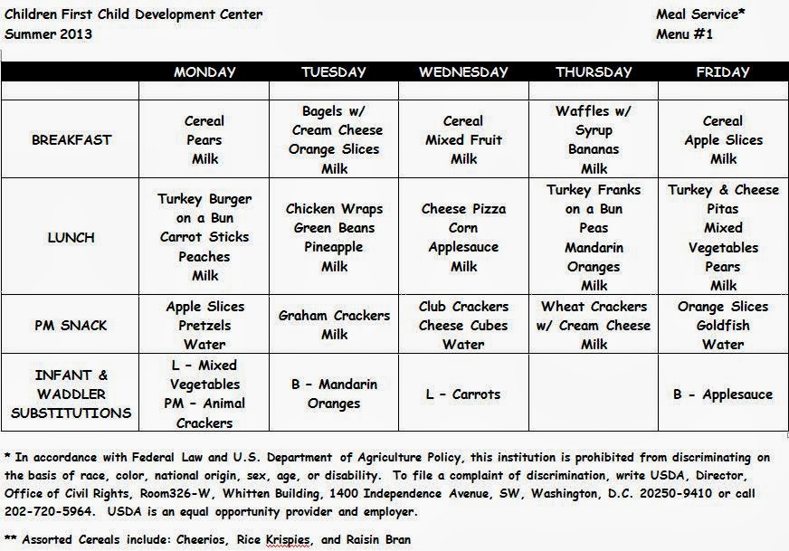 Ms. Debbie is our school cook. She has a rotating menu that is used within the center. If she makes any adjustments to the food service the teachers of the classroom will post the substitutions on the communication board outside of the classroom.